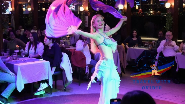 Programul artistic a fost sarea și piperul serii. Am urmărit dansuri tradiționale din diverse regiuni ale Turciei și, bineînțeles, celebrul belly dance. Protagonista a fost o dansatoare blondă superbă (care, între noi fie vorba, nu prea părea să aibă trăsături locale), care a reușit imediat să ridice lumea la dans.