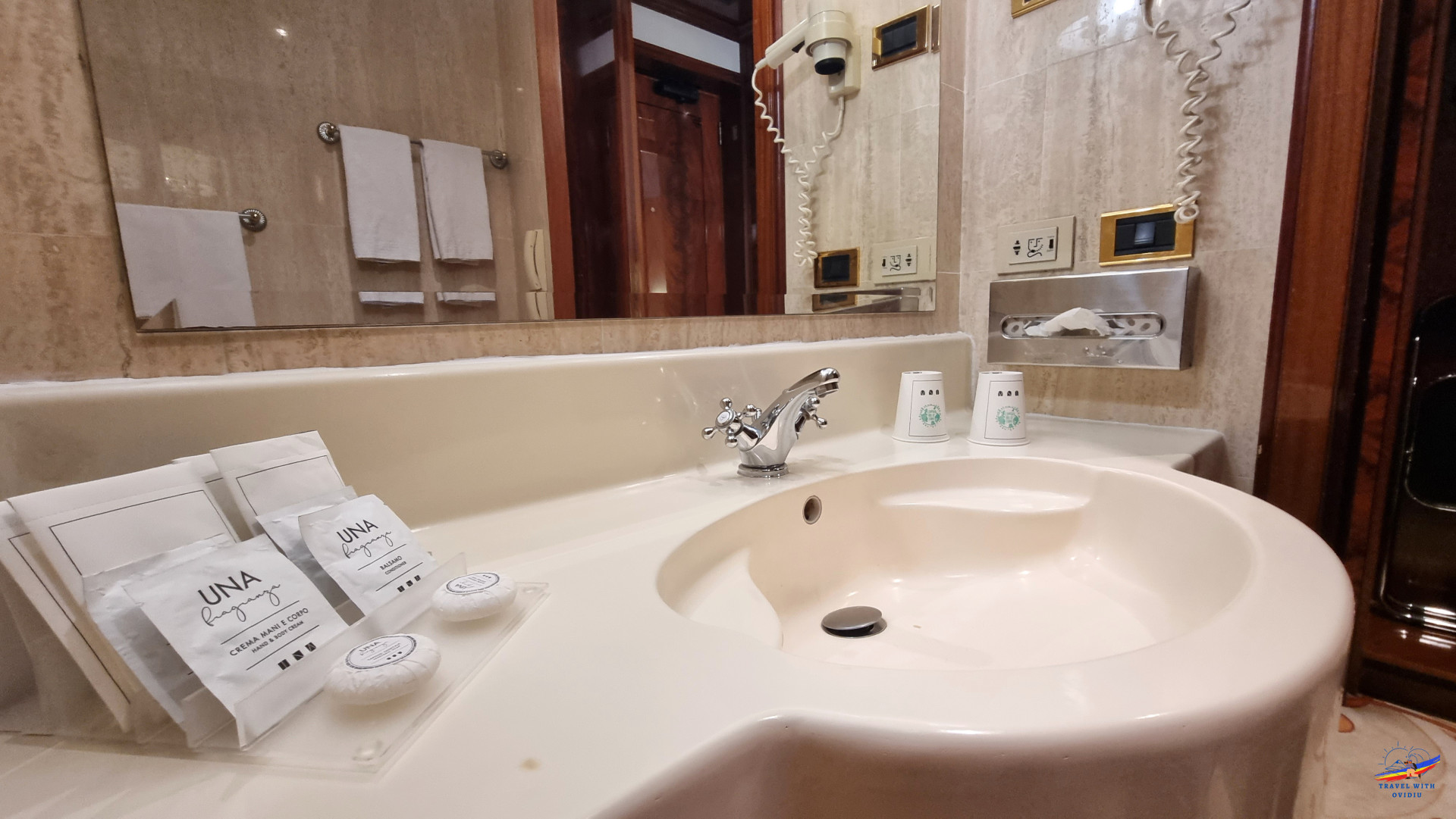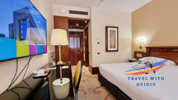 Mi-au plăcut detaliile, veiozele cu accente clasice, biroul din lemn masiv, fotoliul așezat lângă măsuță, televizorul smart imens (pe care, recunosc, l-am folosit doar pentru muzică italiană, seara). Minibarul era bine aprovizionat, iar hotelul ne lăsa zilnic o sticlă de apă plată gratuită, un gest mic, dar care contează.