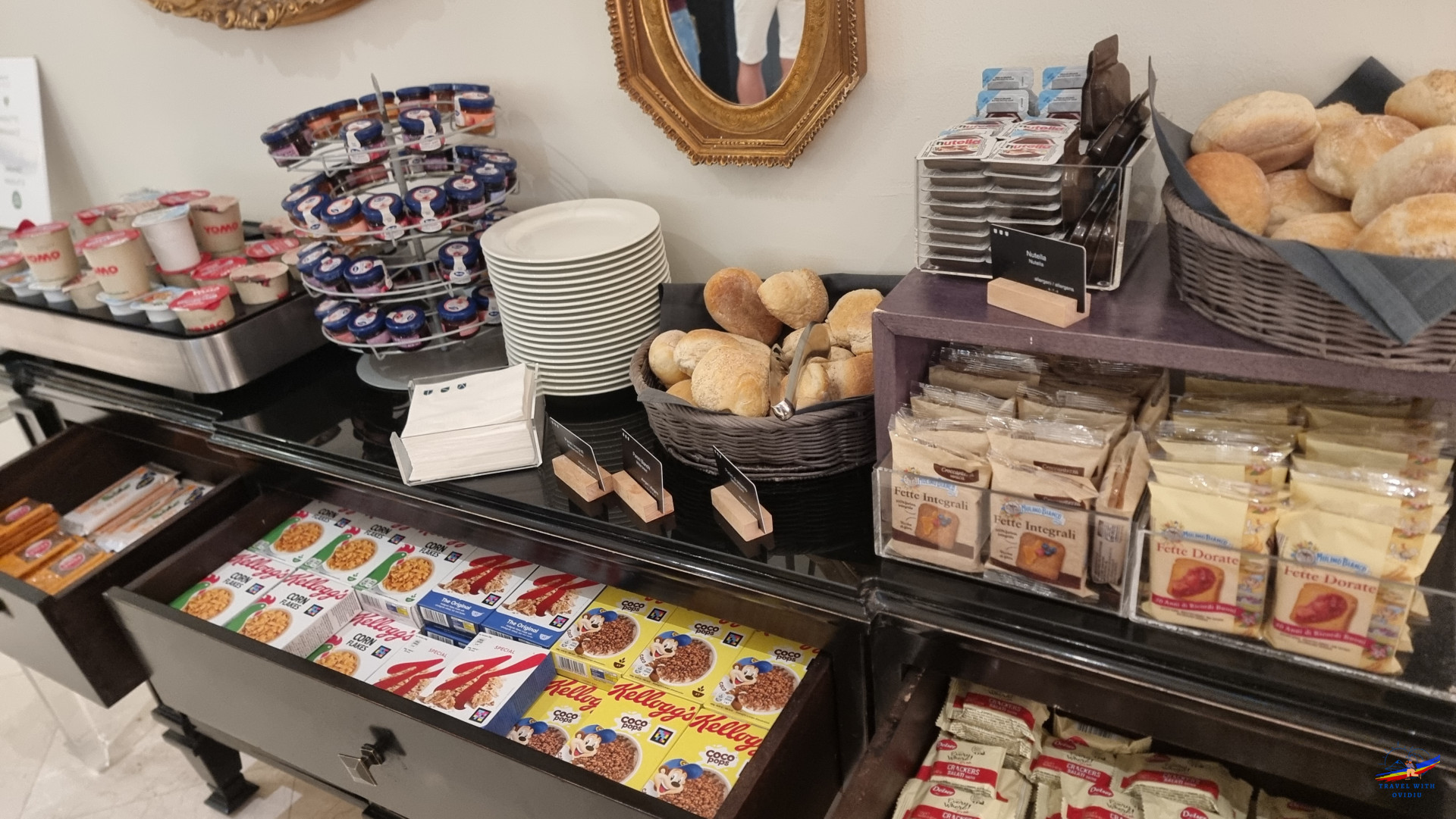 Mă așteptam la un croissant și o cafea, clasicul mic dejun italian. În schimb, am descoperit un bufet complet:cu brânzeturi fine, prosciutto, pancetta, ouă pregătite în toate felurile, legume proaspete, fructe, iaurturi, sucuri naturale și o selecție impresionantă de patiserie și prăjituri. Erau chiar și borcănașe mici de gem, miere și nutella.