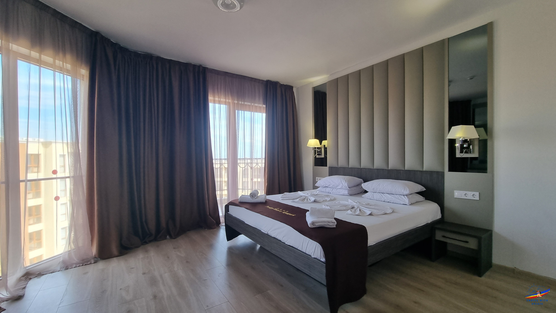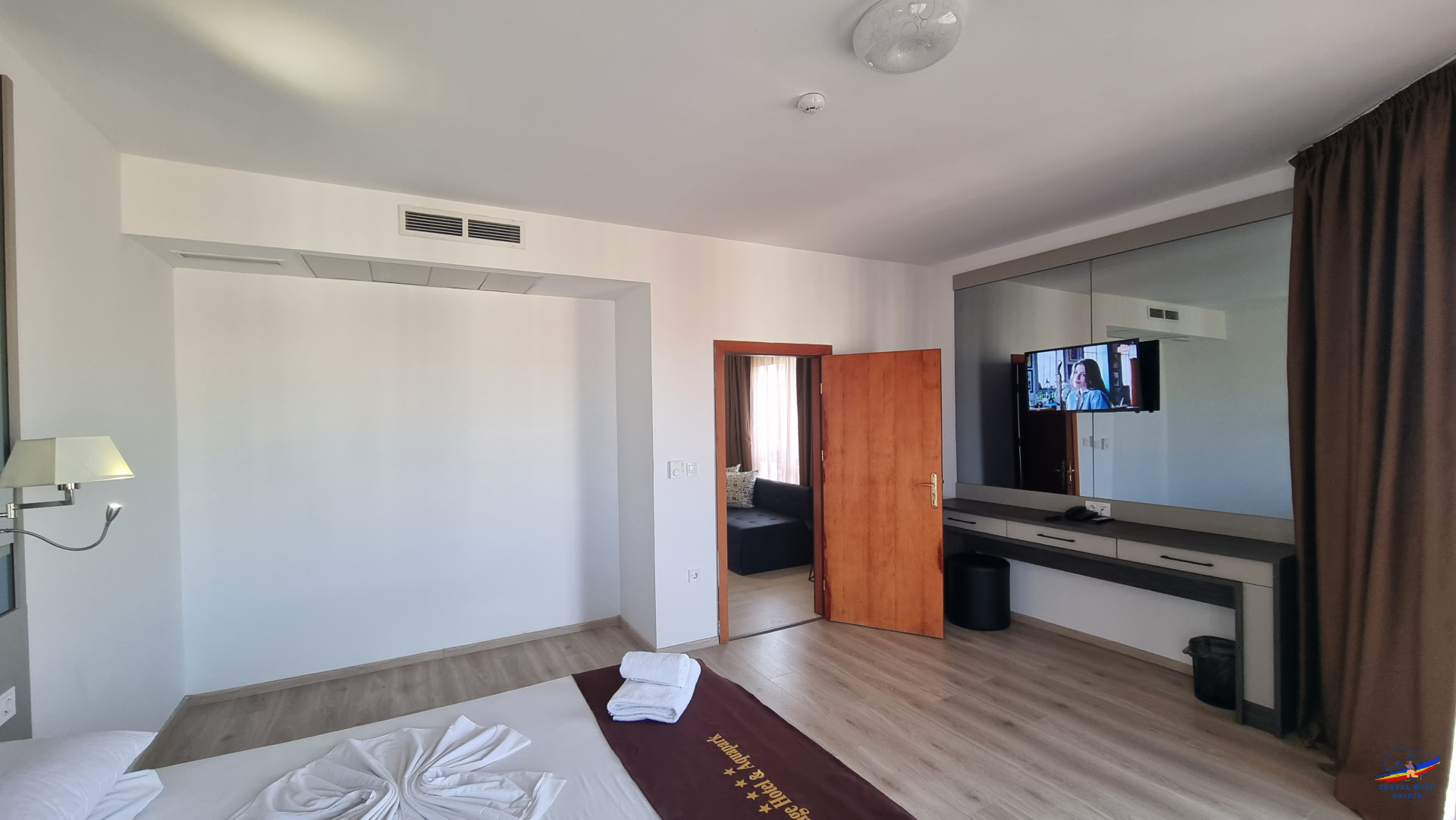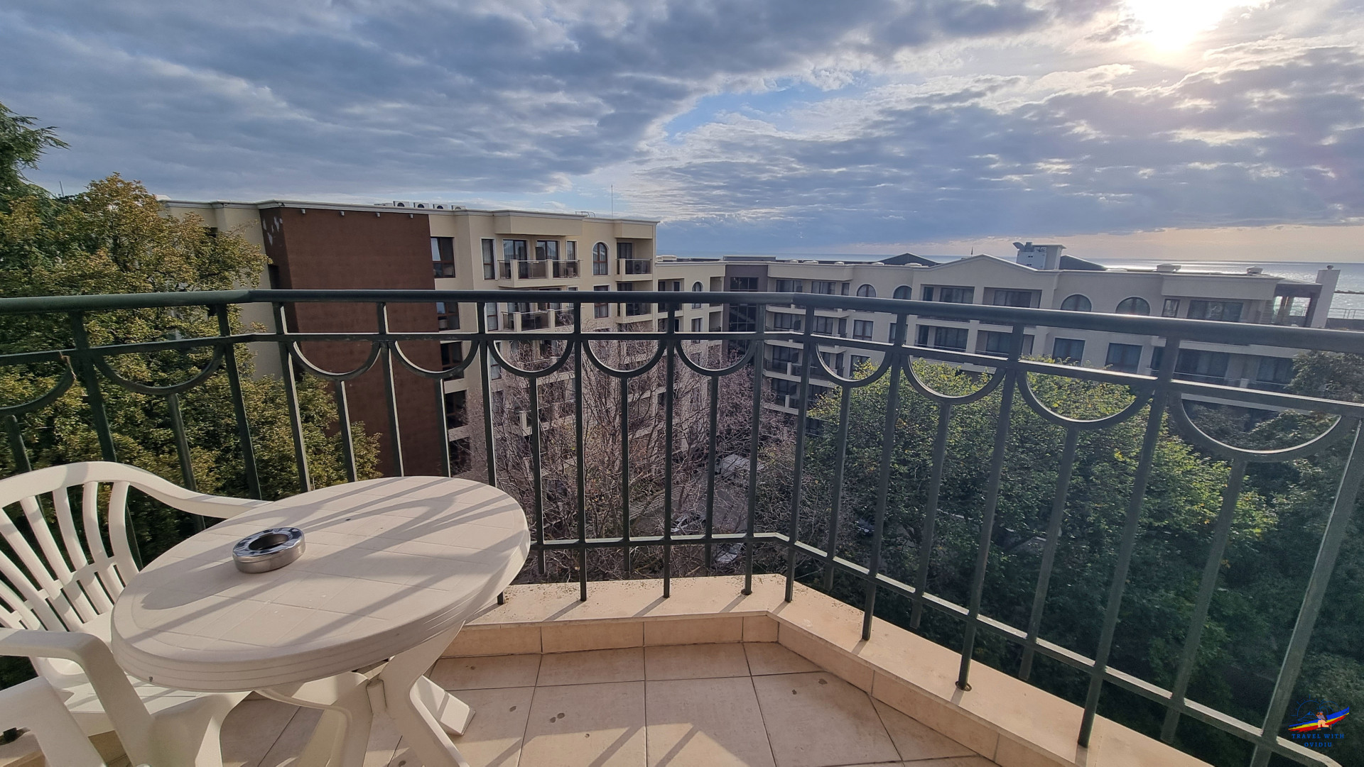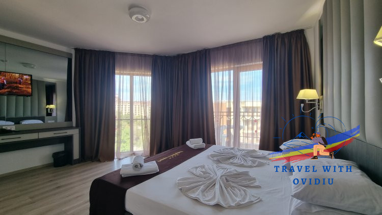 Apartamentul este format din 2 dormitoare, colegul meu a tras lozul câștigător și a stat în dormitorul "mare", îi spun așa datorită mărimii camerei și a patului matrimonial. Dormitorul mare are în compunere un balcon, noi am nimerit pe partea laterală a hotelului, cu vedere atât la mare, peste hotelurile din prima linie a falezei cât și la partea împădurită a stațiunii. Balconul ok ca dimensiuni, cu o masă și 2 scaune. Mai ferit puțin de agitația de la piscină, însă temperaturile nu mai erau chiar de vară și majoritatea au renunțat la piscina exterioară în favoarea celei interioare.