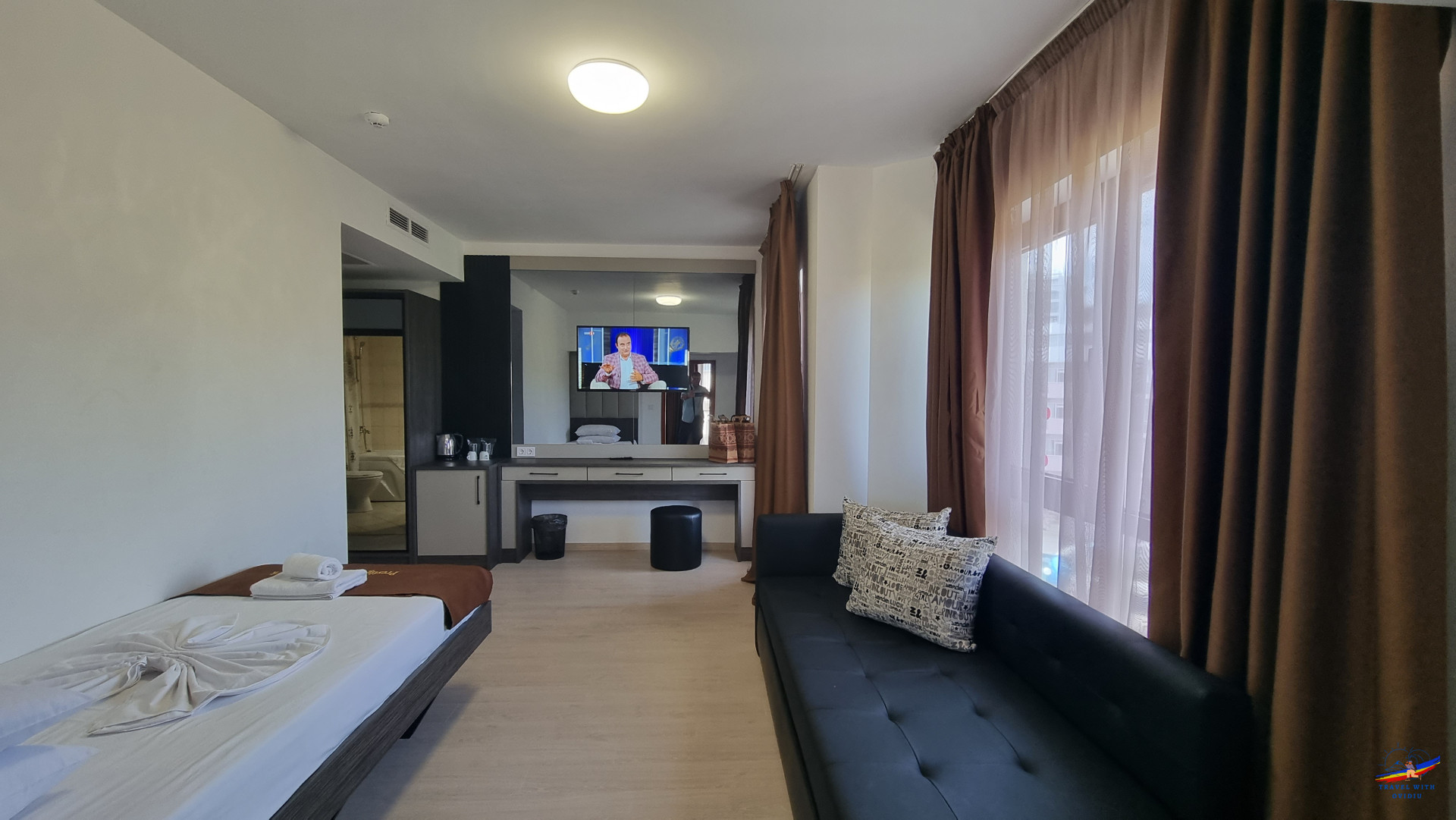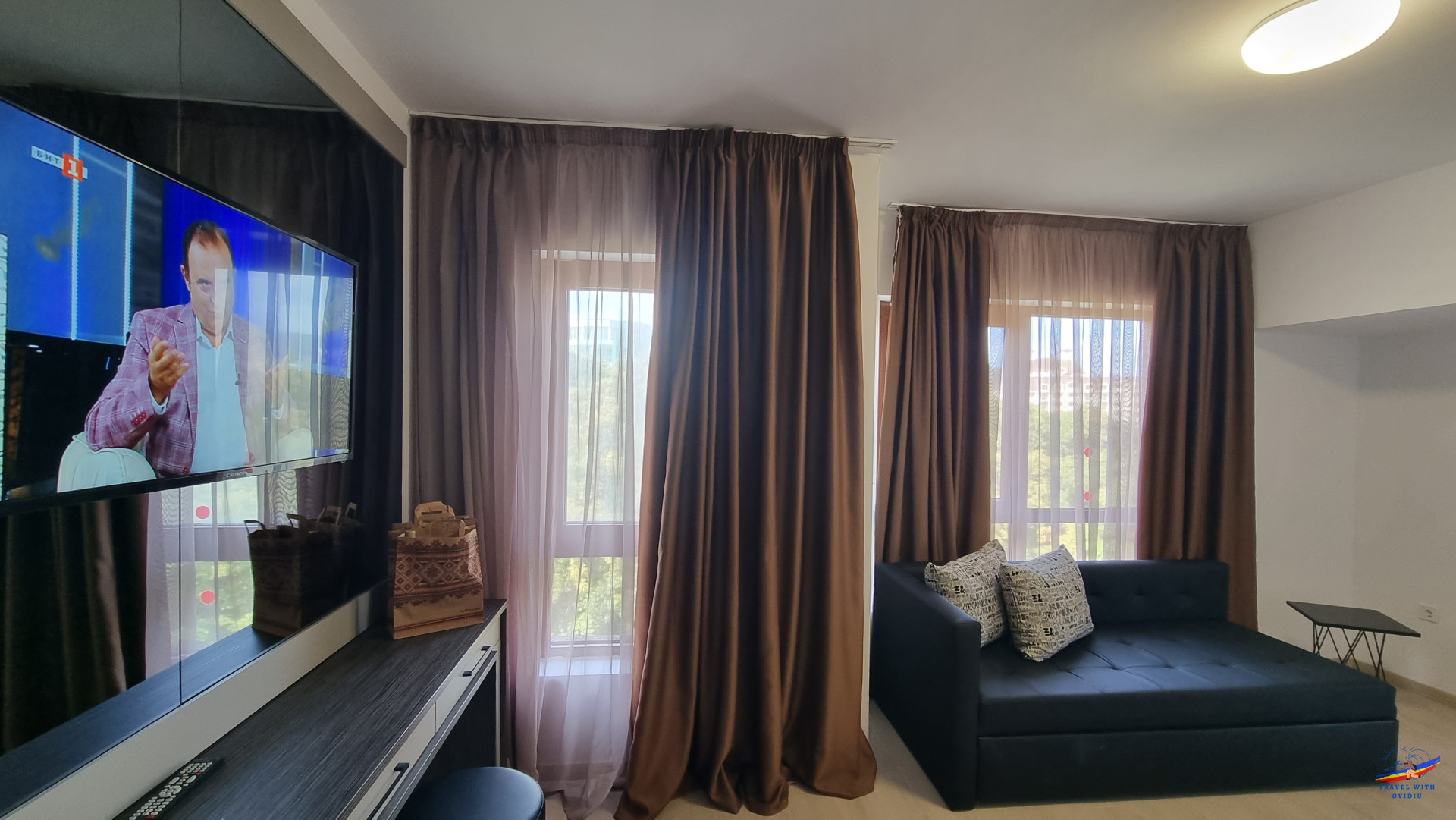 Am împărți un apartament alături de unul dintre prietenii mei, tariful acestuia pentru perioada de final de septembrie a fost de 72 euro/noapte, deci 36 euro de persoană, convenabil. Ambele camere au tv lcd cu diagonală mare, recepție perfectă a canalelor prin satelit. În multitudinea de canale disponibile, există și 2 canale românești - PRO TV internațional și TVR Internațional cu o recepție impecabilă.