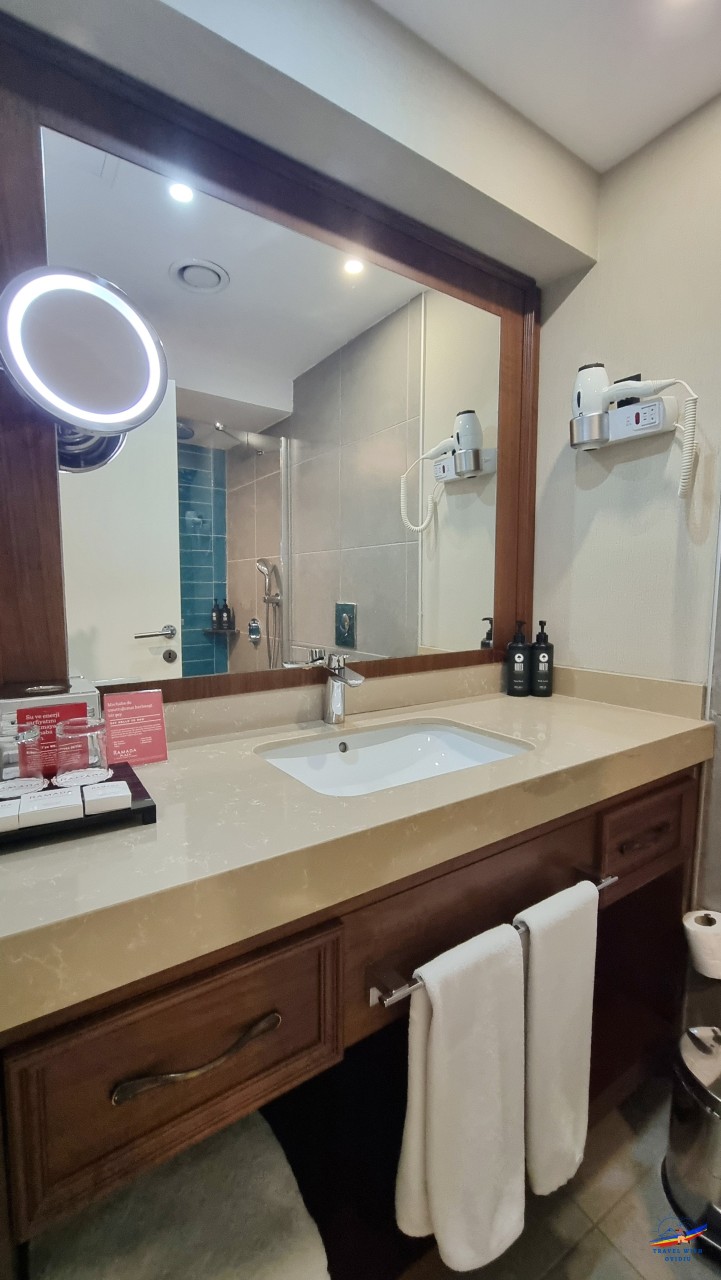 Am avut la dispoziție consumabile personalizate cu brandul hotelului, însă am observat cu surprindere lipsa unor articole care, în România, sunt standard chiar și la 4 stele: periuța și pasta de dinți sau kitul de bărbierit lipseau cu desăvârșire. În schimb, produsele de igienă (săpunul lichid, gelul de duș și șamponul) erau oferite în recipiente mari, completate de o loțiune hidratantă pentru corp. Un mare plus a fost uscătorul de păr, care s-a dovedit a fi unul de calitate, fiind disponibile și prize speciale pentru aparatul de bărbierit.