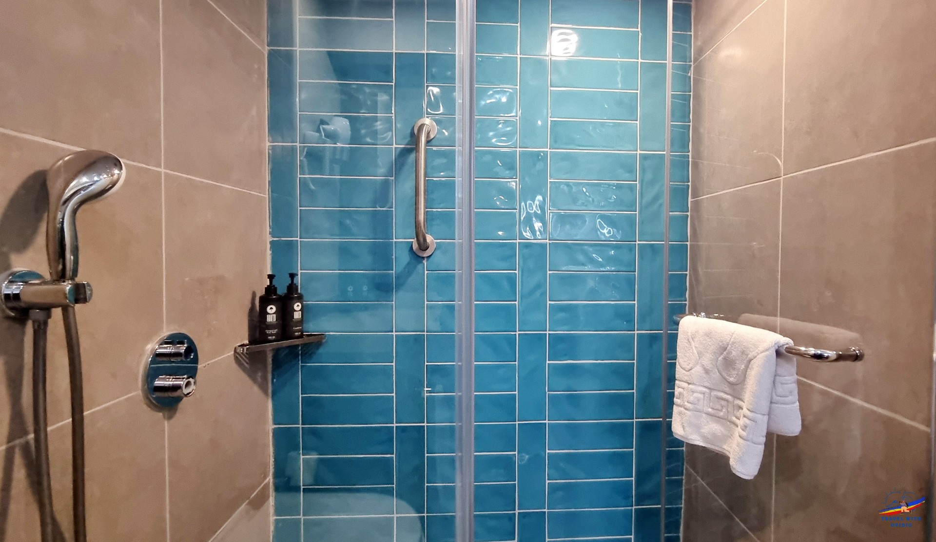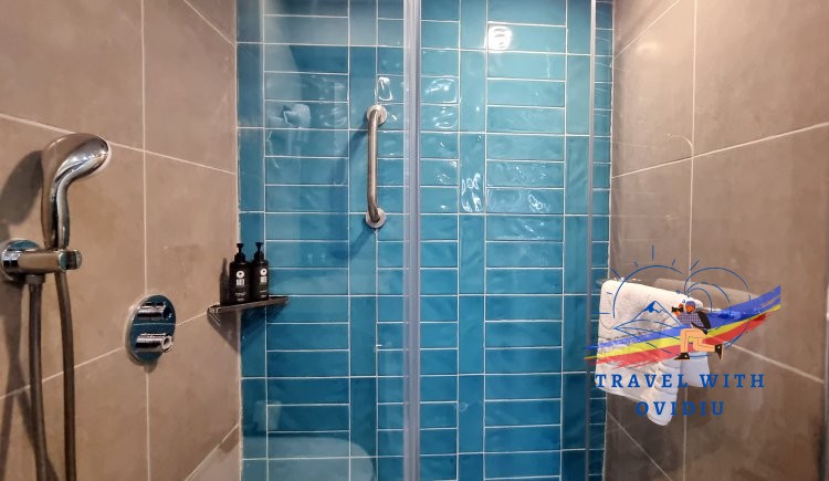 Baia mi s-a părut chiar foarte reușită: spațioasă și dotată cu o cabină de duș modernă, separată printr-un perete de sticlă transparentă care se întindea pe toată lungimea încăperii. Totul strălucea de curățenie, iar apa caldă venea instantaneu, un aspect esențial pentru confort.