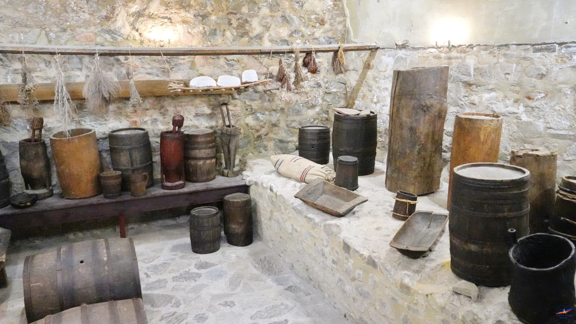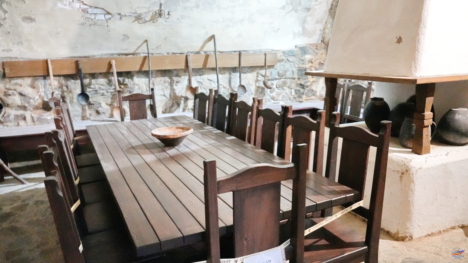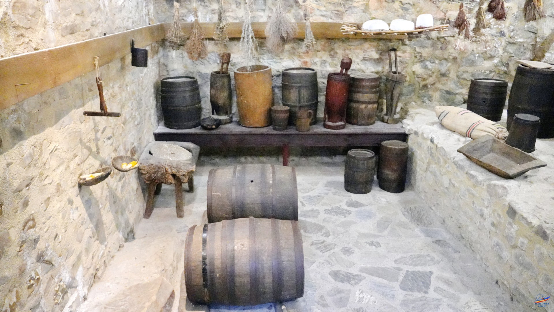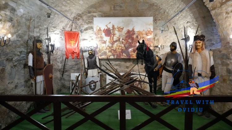 Ne-am continuat drumul spre Camera de provizii și Bucătărie. Aceste încăperi miroseau pur și simplu a istorie. Am văzut butoaie imense, un caș atârnat tradițional în tifon, mirodenii puse la uscat, o vatră rustică, lavițe, și nenumărate vase ceramice și tacâmuri de lemn. Atmosfera epocii, când oștenii se încălzeau la vetre mari de piatră și mâncau mămăligă cu carne sărată păzind cu sfințenie bastionul, este redată absolut impecabil.