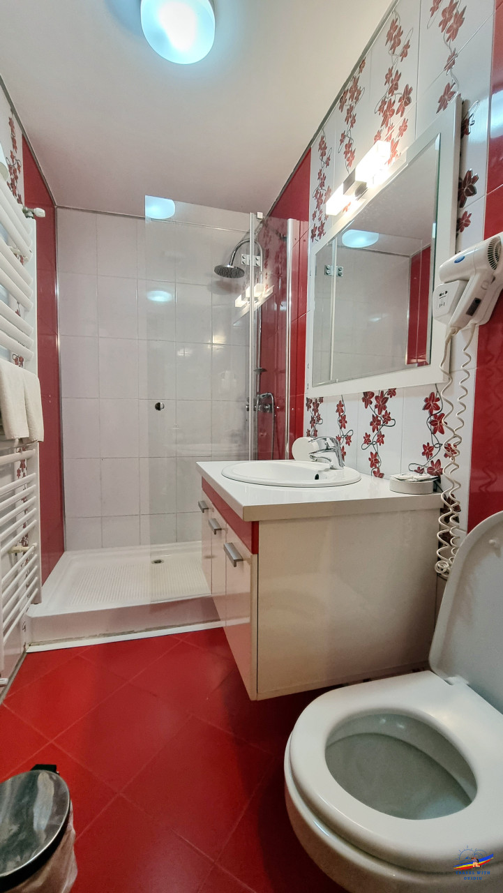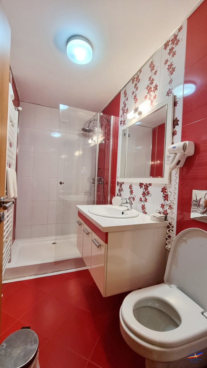 Baia foarte curată, cu tot ceea ce trebuie, consumabile care n-au fost înlocuite niciodată pentru că nu le-am folosit, în general plec de-acasă cu șamponul meu și în afara săpunului evit să folosesc altceva. Mi-a plăcut că exista duș, nu-mi plac băile cu cadă, apă caldă destul de repede seara și mai pe relax dimineața, prosoape curate, albe, frumos mirositoare. Nu știu ce balsam folosesc, dar tare primăvară se simțea în baie. Feon perfect funcțional.