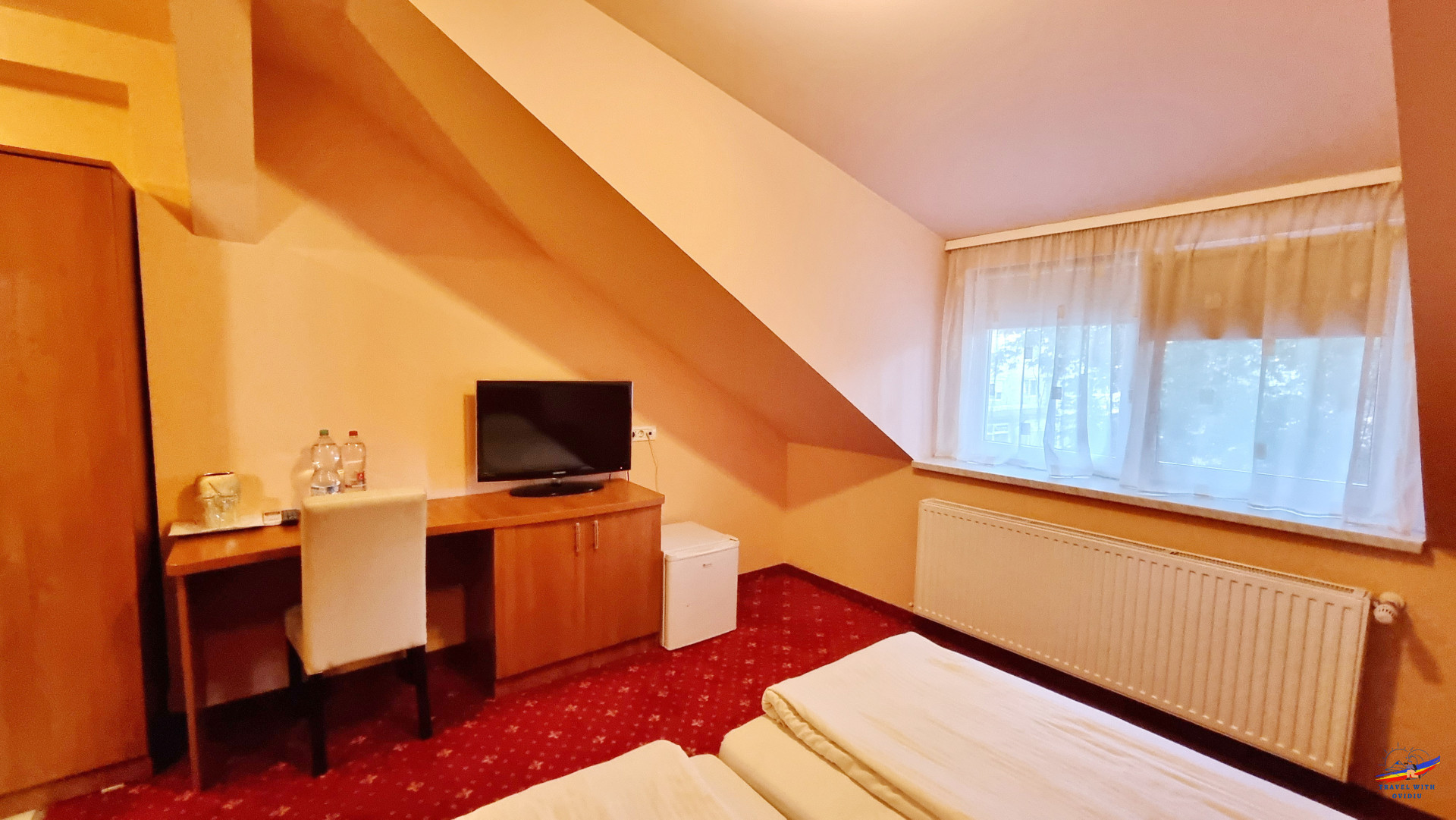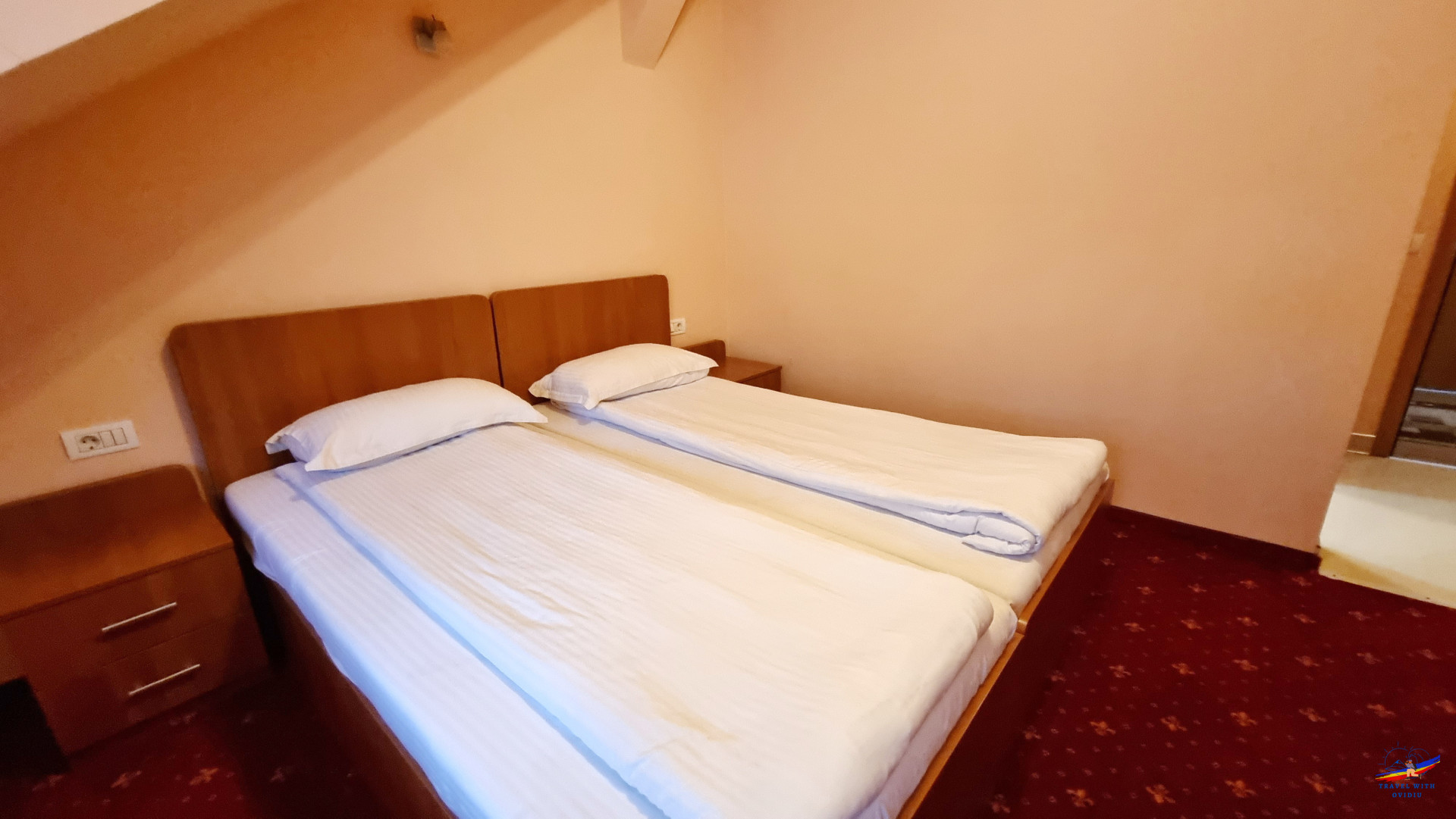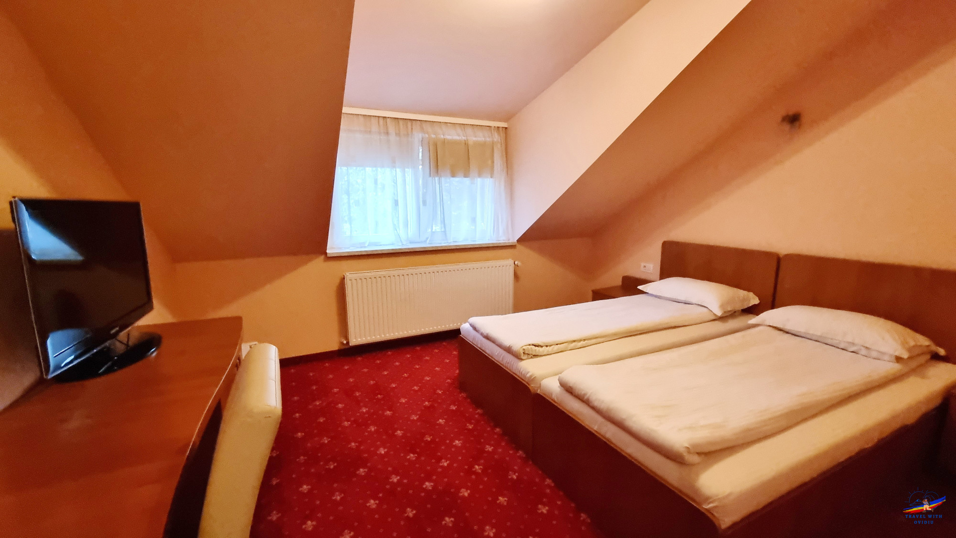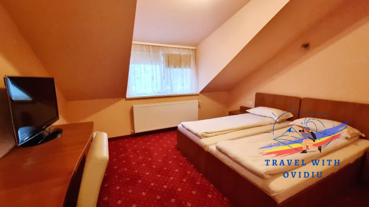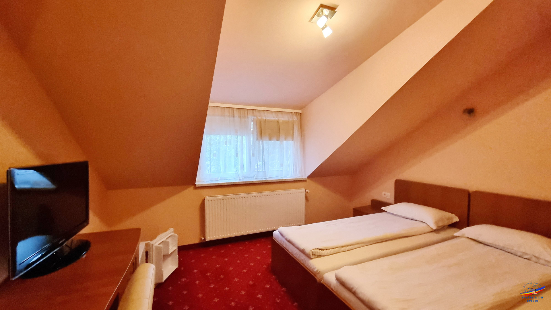Camera destul de mare, cu 2 paturi twin alăturate, lenjerie impecabilă și frumos mirositoare, mochetă curată, întreținută, un tv lcd cu diagonală ok și multe canale cu recepție foarte bună, minifrigider, un birou cu scaun, dulap, două noptiere fără veioze, dar exista o aplică pe perete, deasupra patului. Poate singurul inconvenient a fost tavanul, care pe partea geamului era înclinat, dar așa a fost proiectul pensiunii.